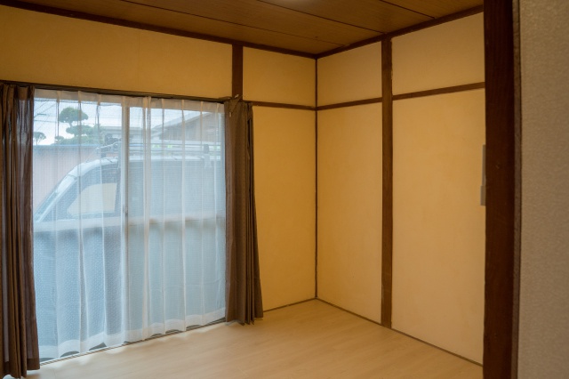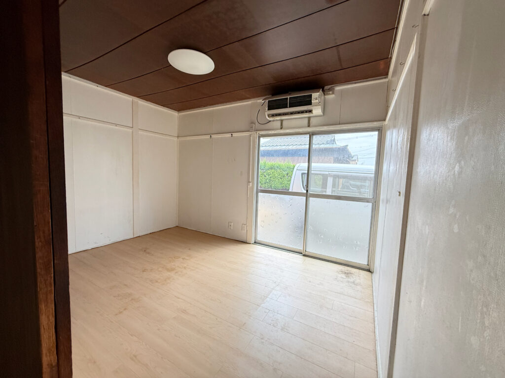 室内全体の状況 長期入居ながら、床には下敷きが丁寧に敷かれていたため、フロアタイルは比較的良好な状態で保たれていました。壁は入居時に軽量塗材で仕上げており、目立った損傷はありません。