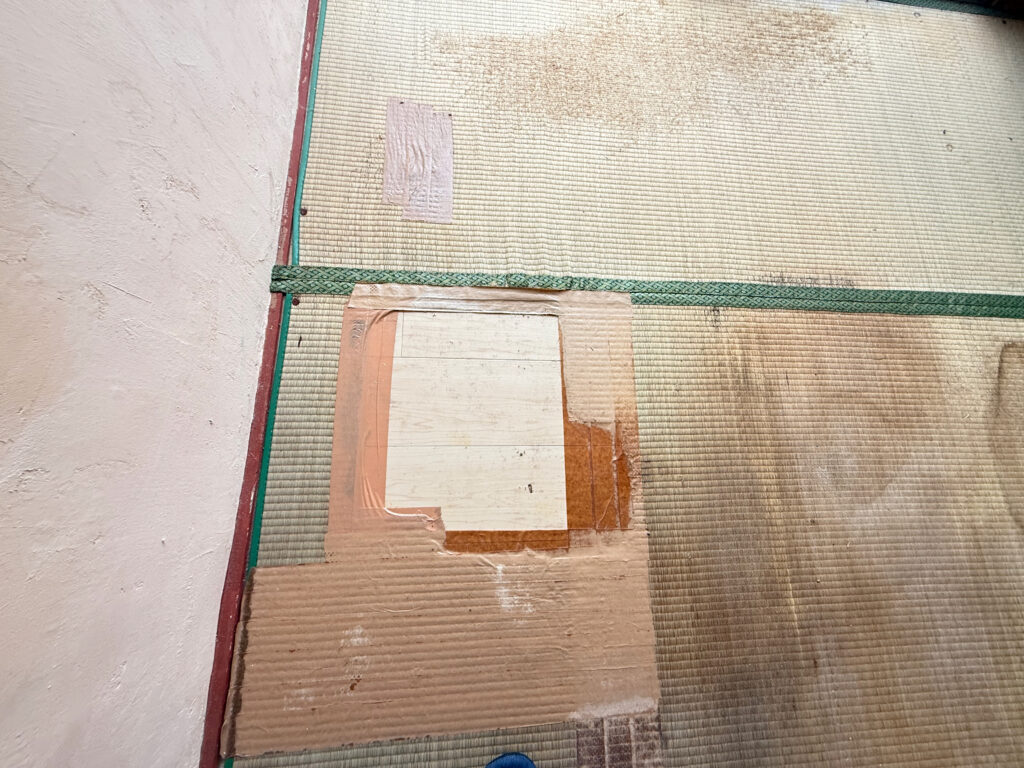 和室(ゴザ・フロアタイル下地) もう一室はゴザが敷かれていますが、その下はフロアタイルになっており、撤去すればすっきりとした状態に戻せます。押入れも備え付けです。
