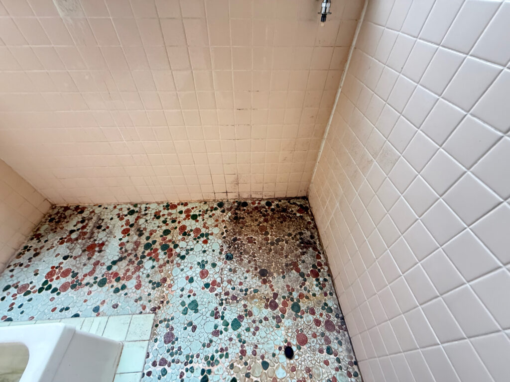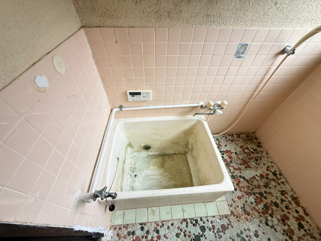 浴室・洗濯機置き場 浴室横に洗濯機置き場があり、専用の電気配線も完備。ただし、浴室まわりと洗濯機置き場には汚れが見られ、クリーニングで対応できるかどうか確認が必要な状態です。